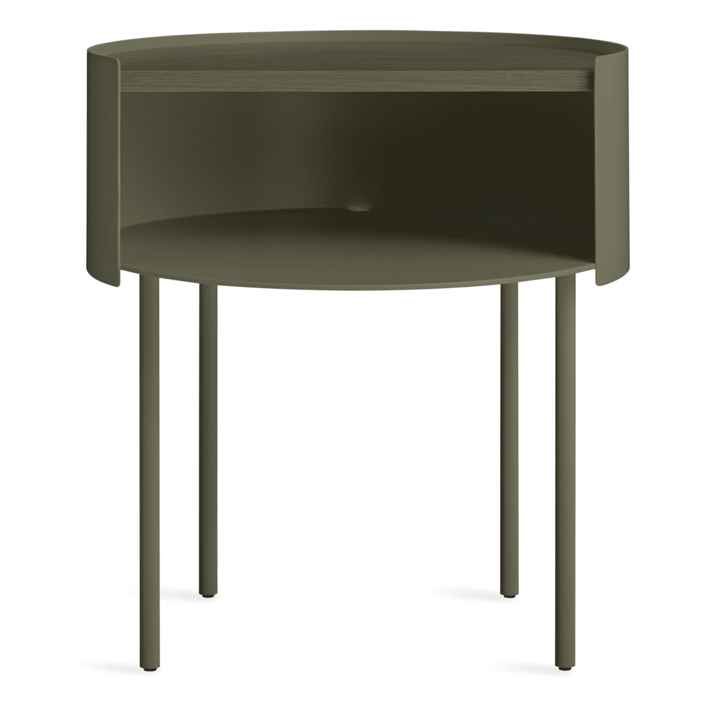 Dark Olive: engineered wood with painted ash veneer top and powder-coated steel base.