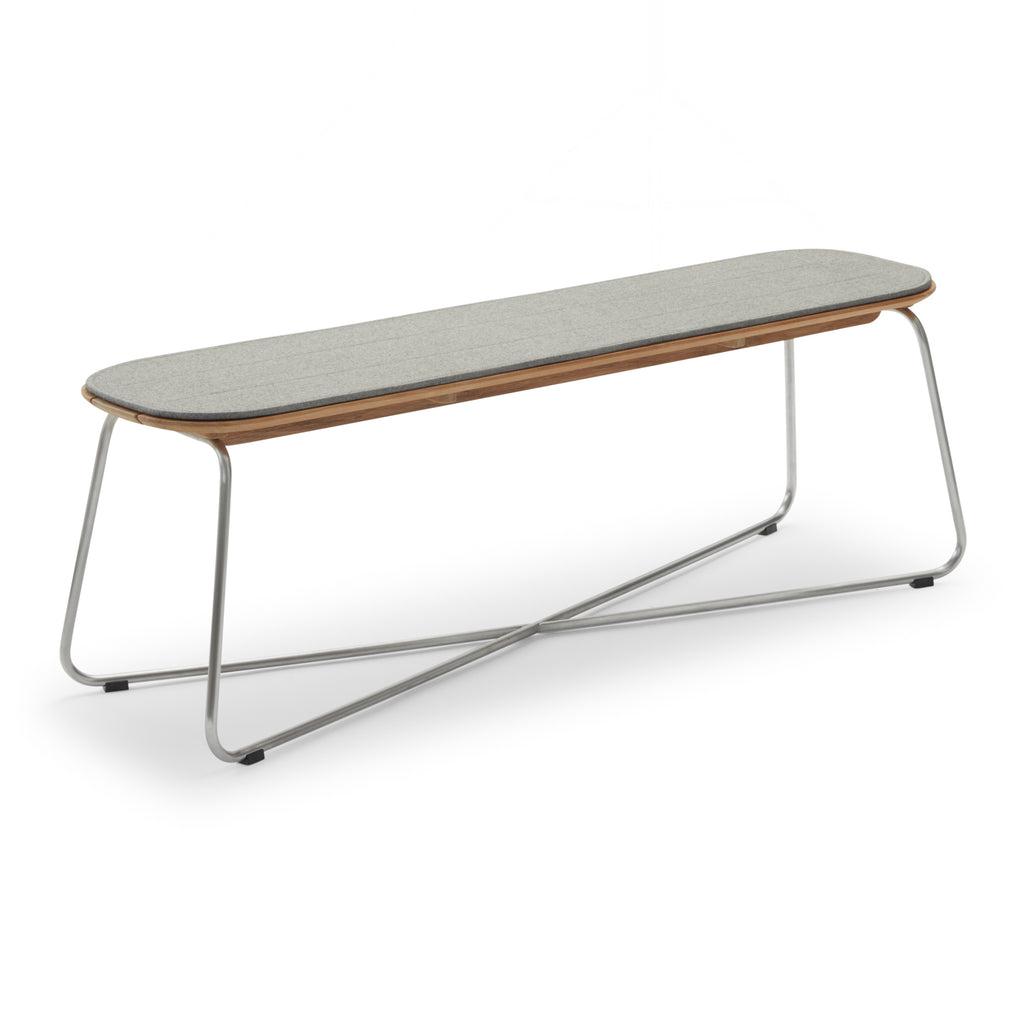 Designed by Bjarke Ingels Group for the the Skagerak Collection by Fritz Hansen, the Lilium Bench is a multifunctional work of art. Ideal as an outdoor dining bench, this piece can also be used as a poolside lounge table, surrounded by chairs, and underneath a shading umbrella. Showcasing a sturdy stainless steel and teak wood design, this bench is naturally resistant to sun and weather and the wood will adopt a silver patina over time. Top with cushions for a comfortable outdoor rest spot, or mix and match with other outdoor seating to create the perfect al fresco dinner option.