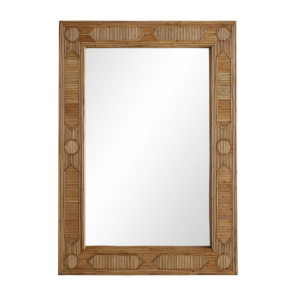 Geometric inlay of natural rattan creates a decorative patterned frame surrounding a plain rectangular mirror. Rattan will vary.