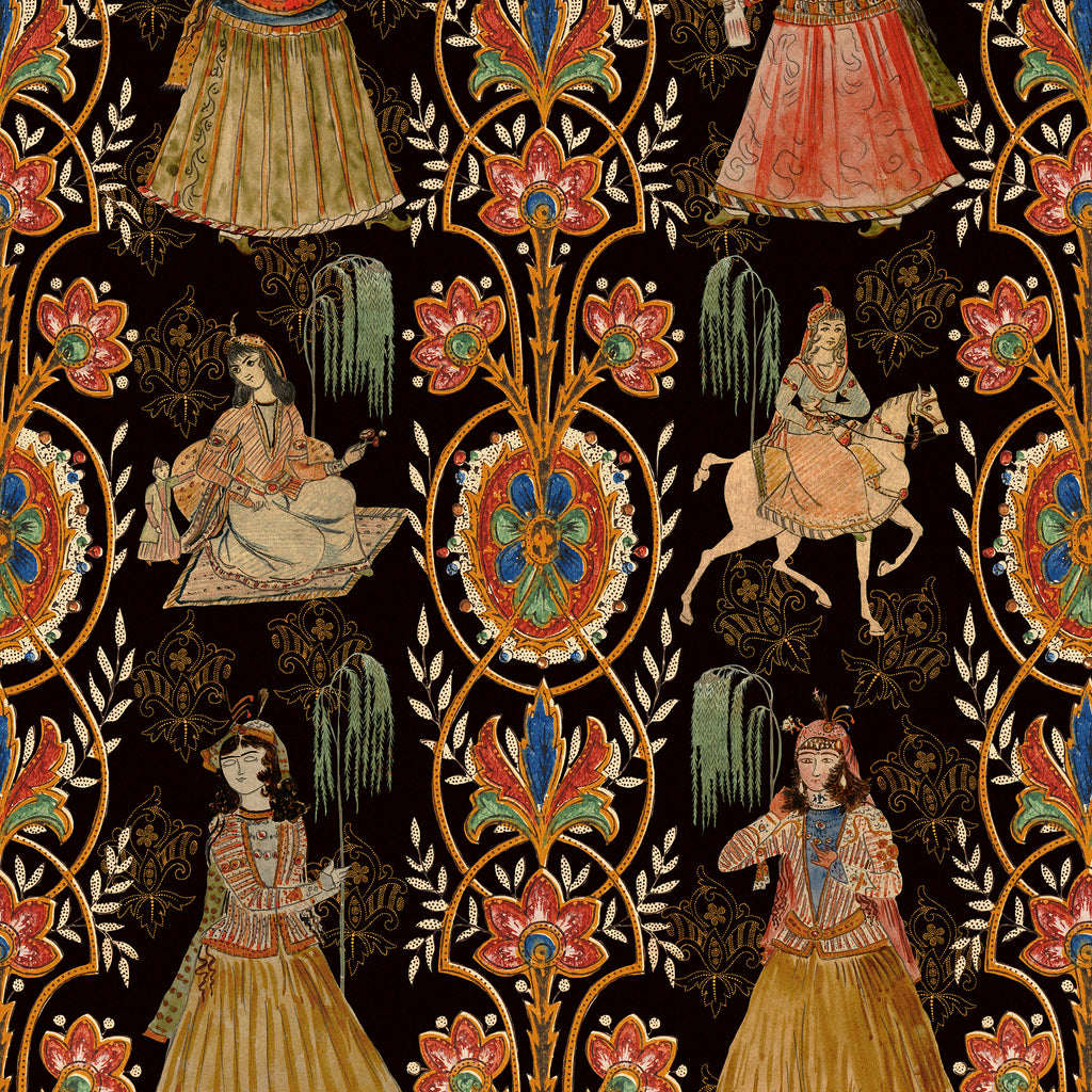 Featuring local women in traditional dress against a vibrant or intense, black or red background, the entrancing MAGHREBIAN FOLKTALE print is brought to life, adding a pop of color to the home. Placed around striking, colorful floral motifs the beauty of Maghrebian fashion is celebrated from ornamental headwear to luxurious, flowing garments. Transport the magic of the region to your home directly with this bold and vivacious wallpaper.