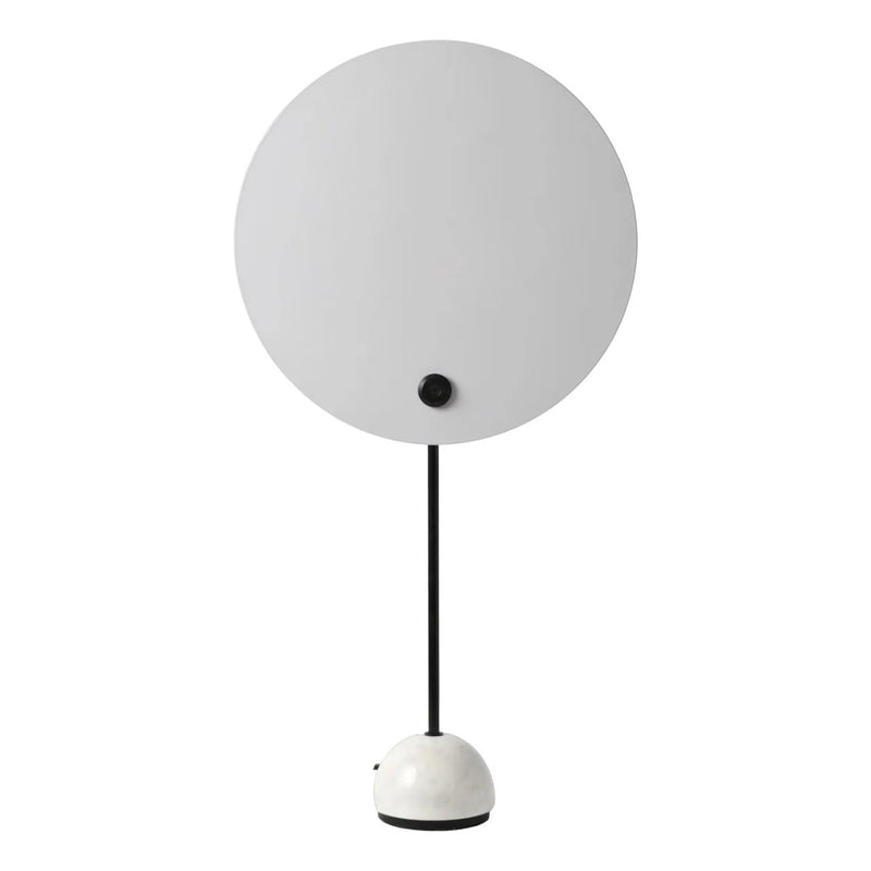 Table lamp with an aluminum circular reflector which shields the lighting distribution, giving the effect of a solar eclipse. The circular screen is painted in white and black, the stem and the metal small parts and hemispherical support are chromed. Table version with base in white marble.