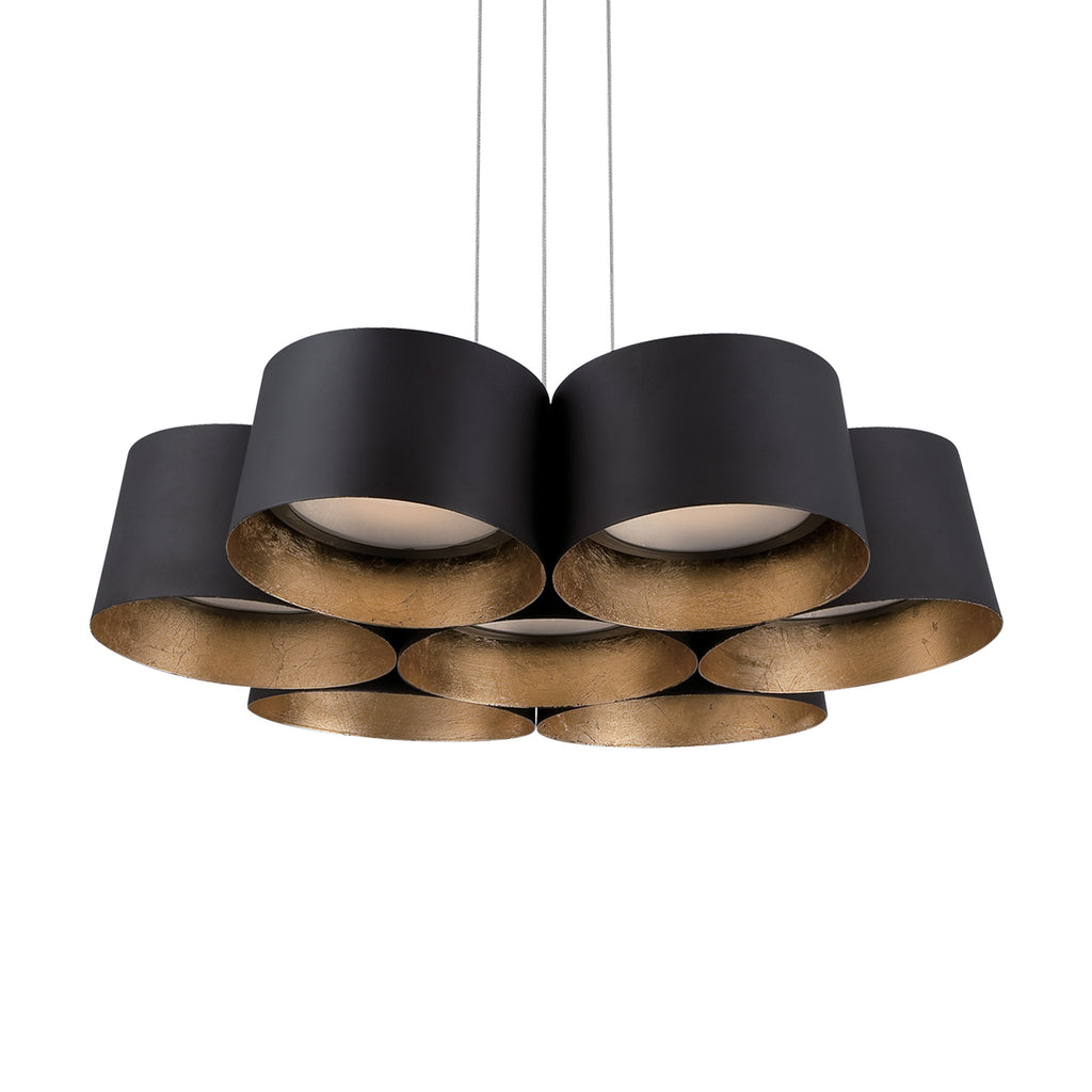 Percussion perfection. This extraordinary cluster of seven LED luminaries, each delivering generous diffused illumination, transforms into a state-of-the-art chandelier. Custom LED modules provide high quality lumens and dimming control. Hand finished with a Black / Gold Leaf finish. Now also available as a 24” pendant with overstated proportions for a grand statement.