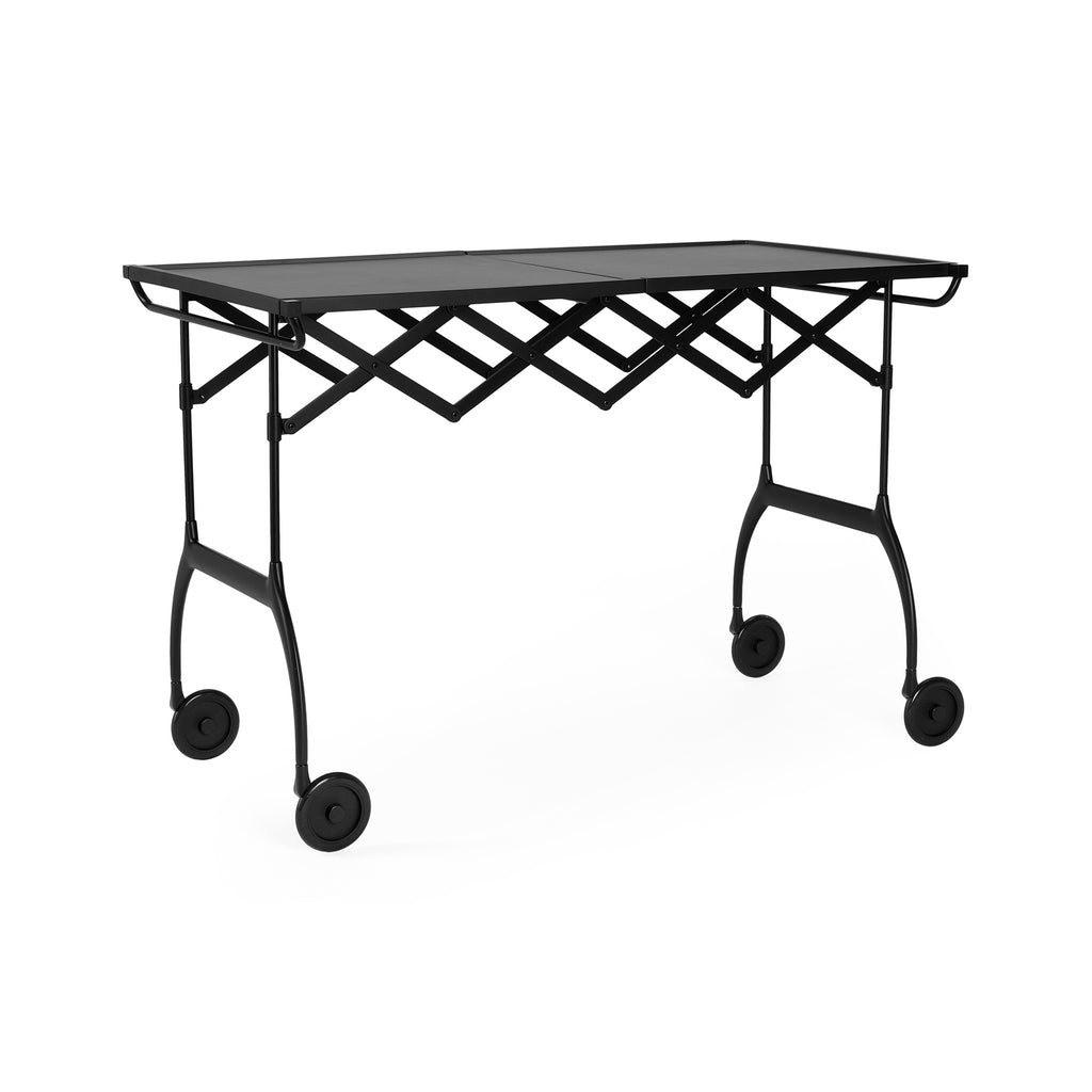 Ideal for buffets and cocktail parties, or as a small occasional table, the Matte Battista Trolley from Kartell is more attractive and practical than ever. Foldable and portable, this trolley design is perfect for adding additional tabletop space to a living room, lounge, or dining room. Top with serving pieces, dinnerware, or your own at-home bar set up for a cool and casual spot to let guests help themselves and serve in style.