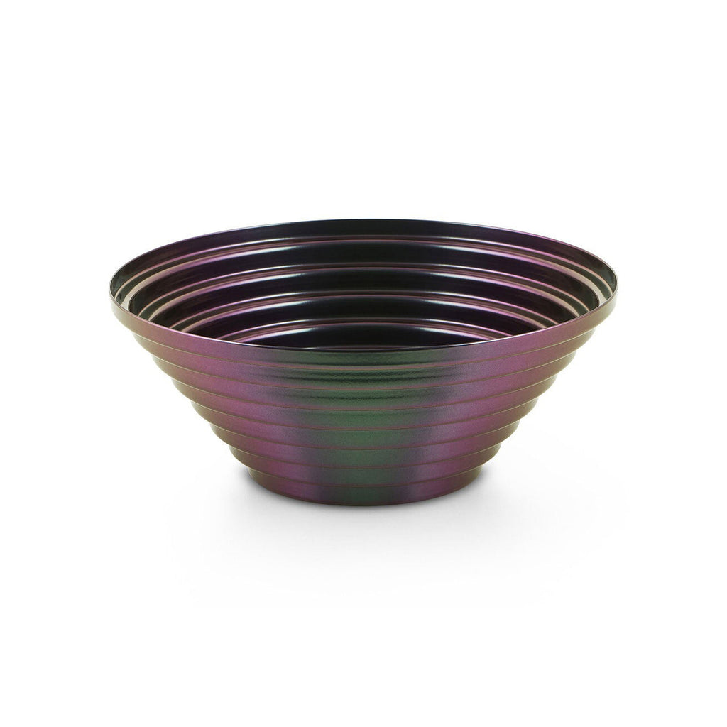 The Maya Round Basket, designed by Giulio Confalonieri in the 1970s, transforms graphic design into a three-dimensional form through expertly cold-formed sheet steel. This elegant edition features the original polished stainless steel alongside two new iridescent color options that shift gracefully between green and violet, offering a refined and contemporary accent for any space.
