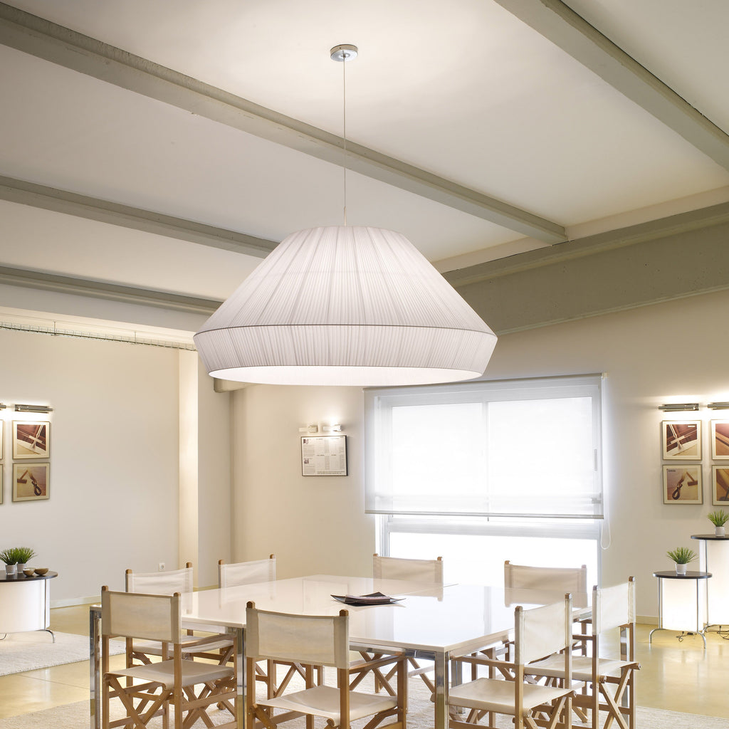 Pendant lamp providing diffused light through a translucent shade of hand wrapped polyester blend ribbon. Height can be easily adjusted via tensor wires. The electrical connection is transparent, and the included diffuser is a frosted injection-molded polycarbonate lens. Available in larger formats.