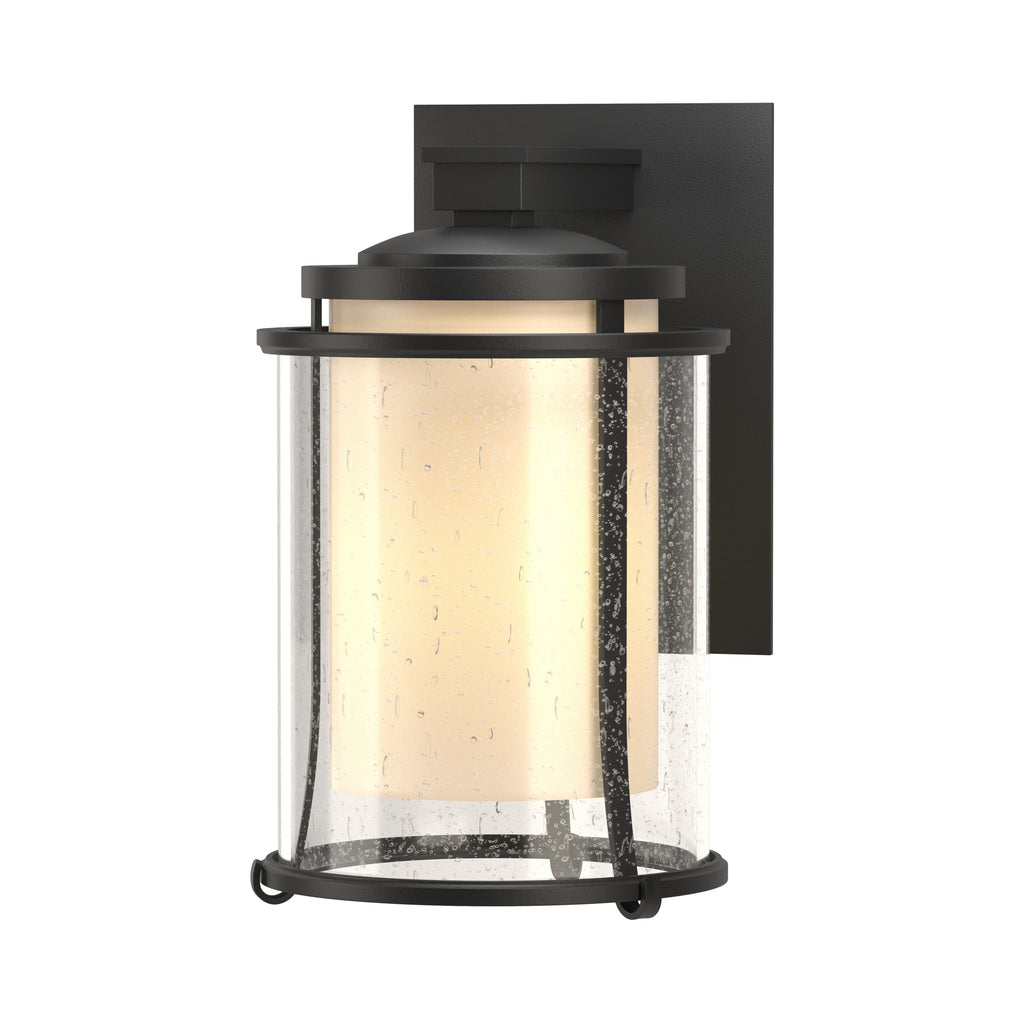 There's something to be said about the welcoming glow of a light on a dark night. Hubbardton Forge's artfully handcrafted Meridian Outdoor Sconce says it well. Metal bands encircle contemporary seeded glass that in turn, surrounds an opaque glass housing the light.
