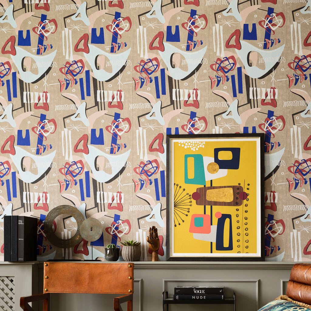 A psychedelic wallpaper design with surrealistic shapes and elements hanging in an imaginary illustrated universe. A perfect addition to our Mid-Century style collection, MESCALINE is a daring abstract art pattern that can be easily use as a feature wall art.