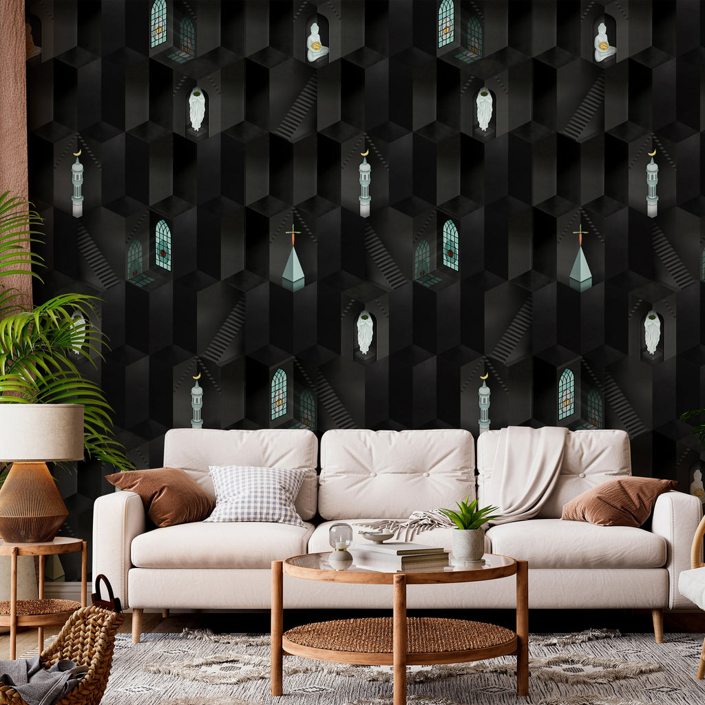 Ideal for a statement wall or eccentric backdrop, the Midnight Black Wallpaper from NLXL boasts quirky images and geometric accents for a wild maze of exploration. Designed by Suzan Hijink, this wallpaper features a memorable mix of religious images, food, and stained glass windows for an eye-catching addition to your home that will have guests searching to find the every day objects hidden within.