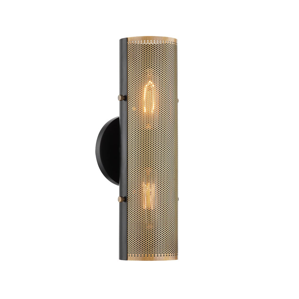 This modern and moody design features cylindrical, two-tones shades of perforated Patina Brass in the front and solid Soft Black in the back. Light shines through the perforated shade to create a dazzling display and exposed pins on the side add a subtle industrial feel. Lit or unlit, this design adds instant drama to any space.