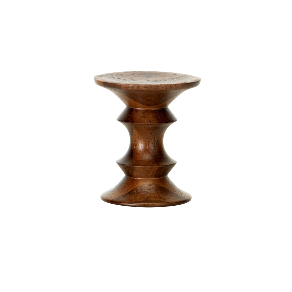 Charles and Ray Eames received a commission to design the interiors of three lobbies in the new Time & Life Building at Rockefeller Center in New York City. In addition to outfitting these spaces, this major project encompassed the development of the comfortably upholstered Lobby Chairs and a group of stools made out of solid walnut. The lathe-turned stools, which were also conceived by Ray to be used as small occasional tables, have distinctive individual profiles. The sculptural and decorative character of the stools makes the most striking impression when they are grouped together. These pieces were inspired by an African stool that stood in the living room of the Eames House, as shown in a photographic series by Monique Jacot from the year 1959.