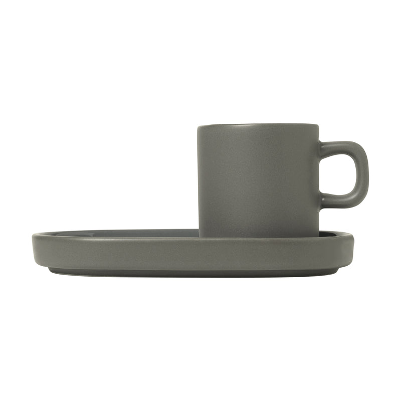Pilar Espresso Cups with Trays, Set of 2 are functional for every occasion. Beautifully shaped yet humble enough to act as a discreet backdrop to the perfectly arranged meal. The new Pilar tableware collection was designed by Floz Design in Germany. Stoneware pieces include bowls, plates, mugs and serve ware. Stacks beautifully for in-cabinet storage. Outside of stoneware is mattee. Inside serving area is glazed for design compliment and easy cleaning. Pilar stoneware is manufactured from clay, quartz and minerals such as calcite and is defined as a ceramic product. The stoneware is molded at very high temperatures using casting techniques. The high temperatures during the firing process make stoneware more stable than clay and less translucent than porcelain.