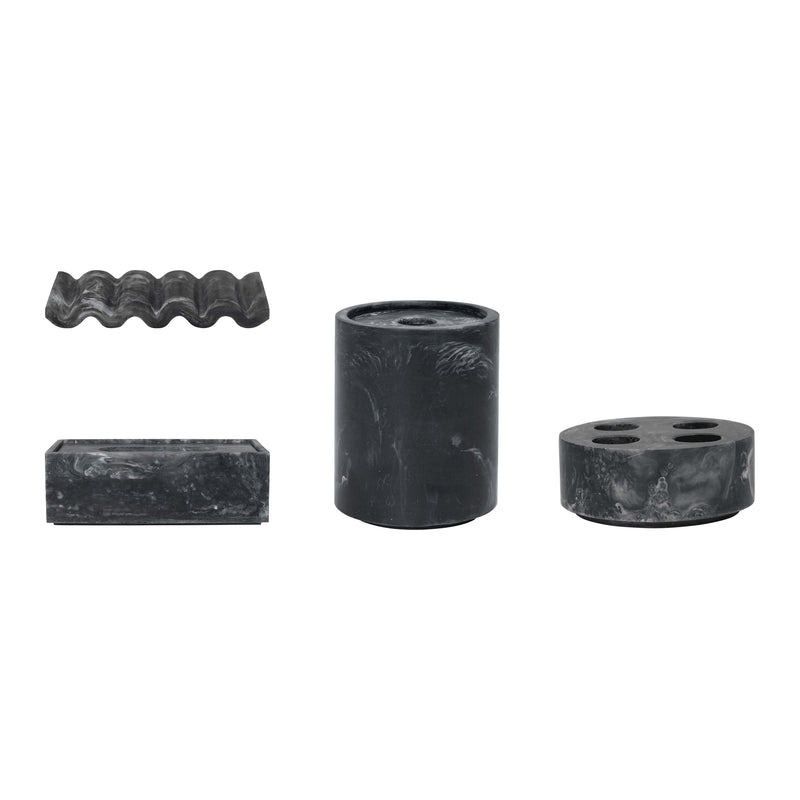 The Mist Bathroom Set from Ferm Living exudes understated elegance with its marbled resin design. Its wave-like ridges promote faster drying and improved hygiene, while its versatile design can be used alone or paired with the Mist Tray. Crafted with durability in mind, this set is a practical and refined addition to any bathroom.