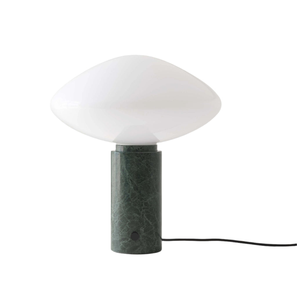 The Mist Table Lamp from &tradition is an elegant addition to any room. Crafted from luxurious mouthblown opal glass atop a solid green marble cylinder, this lamp offers rich material contrast and sophisticated style. Its soft, diffused light mimics a tranquil morning glow, creating a cozy atmosphere perfect for winding down after a long day.
