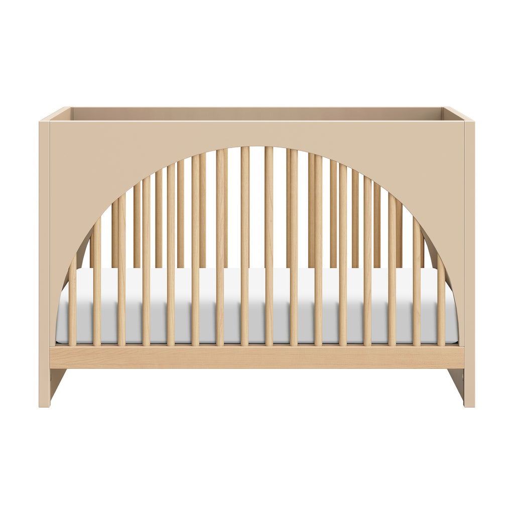 Experience the perfect blend of art and functionality with the Moab 3-in-1 Convertible Crib from Babyletto. Its playful arched panels and tambour side paneling add a touch of pop art and postmodernism to your nursery. As your child grows, this GREENGUARD Gold certified crib easily converts from standard crib to toddler bed to daybed, making it a sustainable choice.