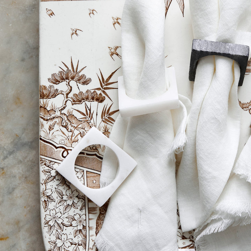 Add an unexpected and elevated touch to your morning or evening meal time with the Modernist Napkin Ring (Set of 4) from Sir Madam. Crafted from natural marble, this set of napkin rings showcases a simple square design with a circular opening, ready to bring a refined touch to your tabletop design. Pair with white, linen napkins to let the natural stone stand out, or use with colorful linens for a pleasant contrast in materials.