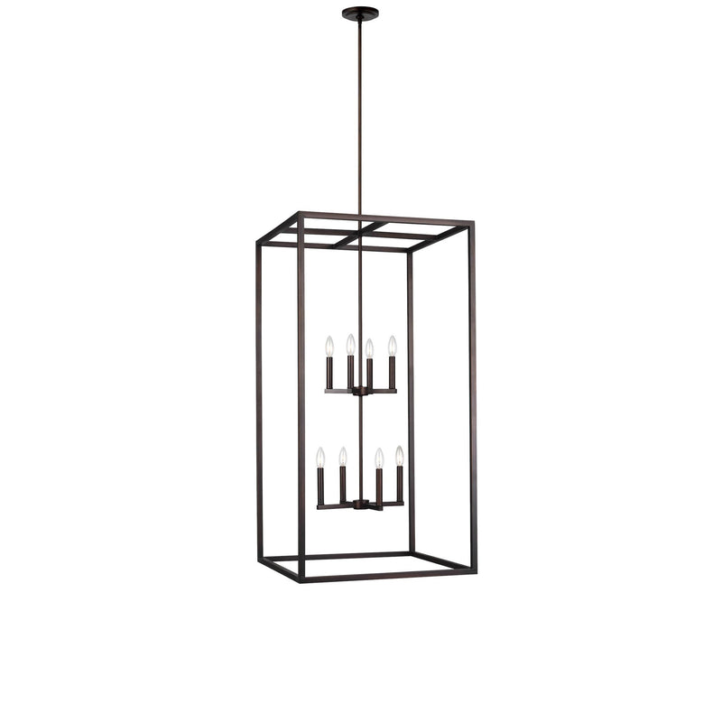 The Sea Gull Collection Moffet Street indoor pendant in bronze, satin brass, washed pine or brushed nickel is the perfect way to achieve your desired fashion or functional needs in your home. Moffet Street offers a distinctive take on a rustic theme. Built in broad steel frames with hand-applied finish that mimics natural wood. This combination of rustic and urban fits comfortably in a wide variety of environments. The sharp, squared lines of the frame complement a wide variety of settings. The collection includes eight-light foyer, four-light foyer, one- light wall sconce, and a six-light island fixture. The Moffet Street Collection is available in three beautiful finishes Brushed Nickel and Satin Brass All fixtures are California Title 24 compliant and damp rated for use in sheltered, damp environments.