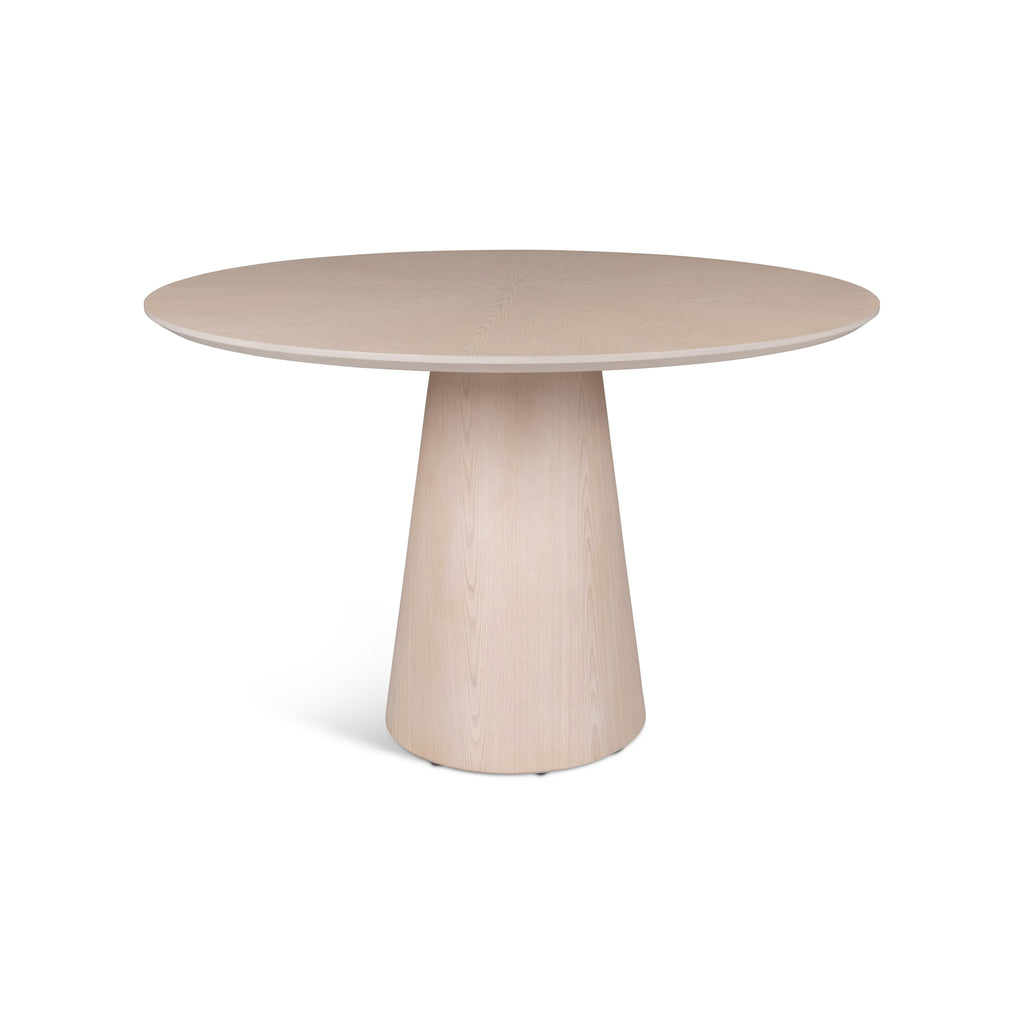 A prominent piece of geometric simplicity, the Mona Round Dining Table with Wooden Top from Urbia brings a clean, contemporary charm to your dining room. Crafted in Brazil, this table features an oak veneer top with a meticulously beveled edge for a touch of refinement. The top rests on a sculptural, conical pedestal base, creating a sense of harmony and balance. Perfect for seating four to six guests, this modern and personable design turns every meal into a stylish statement.