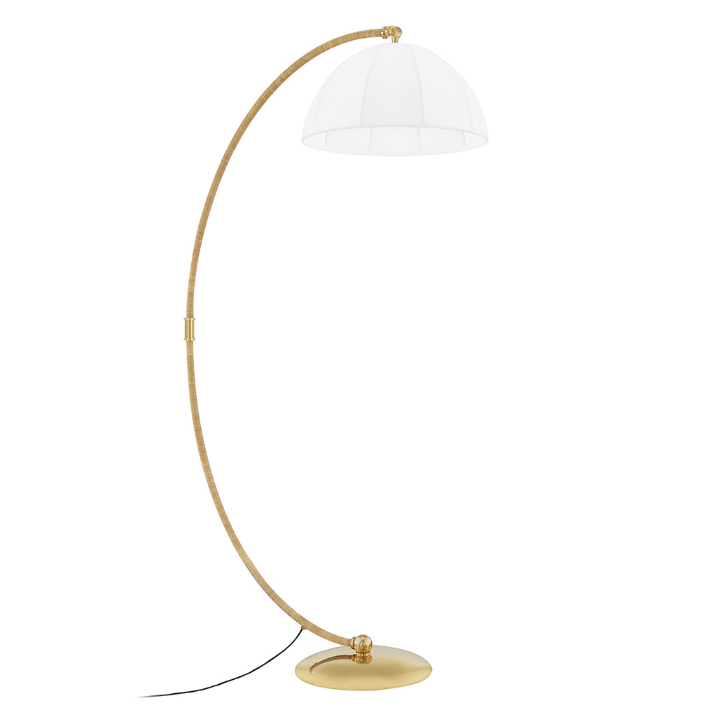 A simple silhouette and natural materials bring Montague to life. A long, curved arm wrapped in rattan sprouts from an aged brass base and reaches over six-and-a-half feet into the air. Bright light is cast down from the white linen dome shade and also glows softly through it.