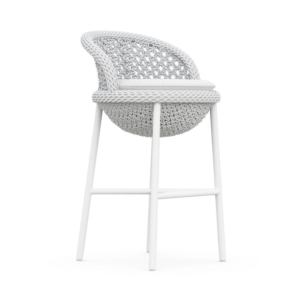 Both captivating and sleek, the Montauk Stool from Azzurro Living offers an outdoor seating solution where both function and detail are front of mind. Featuring a matte white aluminum frame, this stool offers handwoven rope detailing in the style of macrame, offering a familiar, yet elevated update to a classic design. Topped with a Solvita Performance Fabric upholstered high-density foam cushion, this stool is ready to take on the elements and offer UV and stain protection. Designed for both indoor and outdoor living, this stool is suitable for your poolside bar area or back deck high-top table seating group. Simply pair with your favorite friends and a pitcher of sangria for the ultimate afternoon relaxation set.