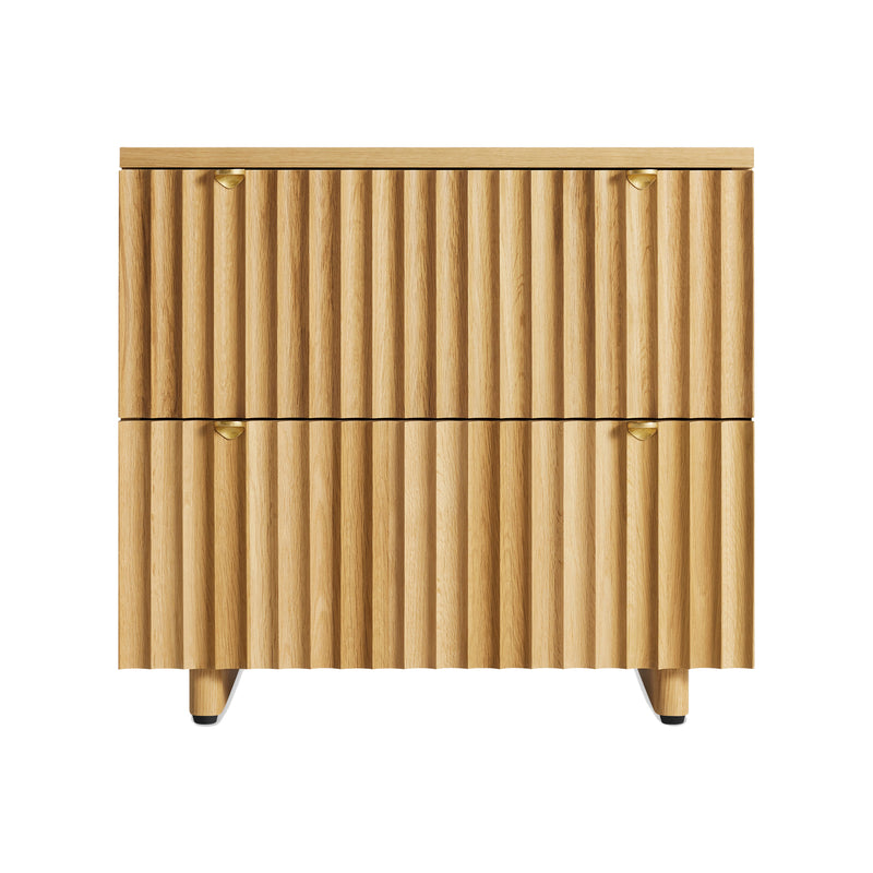 The Murmur Nightstand from Blu Dot showcases refined elegance through its fluted wood design, creating a seamless pattern of rich texture. Small sandcast brass pulls nestled within the grooves add a touch of subtle sophistication. Featuring convex legs and soft-close drawers, this nightstand combines beauty and function effortlessly. Available in a variety of stunning shapes and sizes to suit your space.