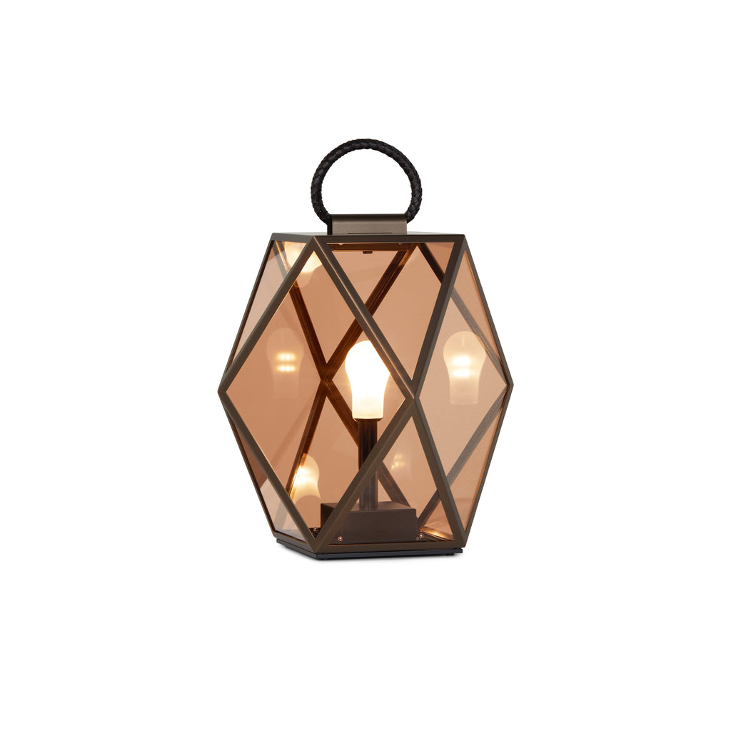 The simulation of the light bulb creates an alternation of lines, giving it a more modern appearance, while also guaranteeing better performance. Both versions are now available in small and medium sizes. The bronze finish of the Muse Lantern has been treated to withstand outdoor spaces and atmospheric conditions, with a handle in woven leather. The plastic diffuser in the Outdoor version remains in a transparent amber finish.