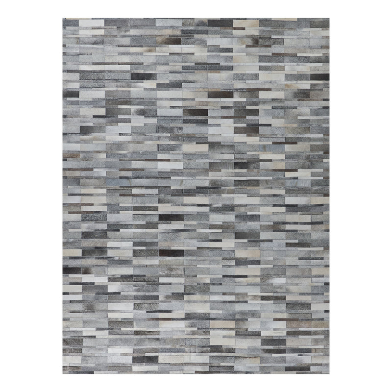 The Natural Hide Brick Area Rug from Exquisite Rugs is a sophisticated study in tonal depth, utilizing the organic variations of genuine leather to create a dynamic, modern floor covering. Hand-assembled from premium hair-on cowhide, this rug features a rhythmic geometric layout that organizes various shades into a sleek, tiled mosaic. Because each segment of hide possesses its own unique grain and luster, the monochromatic palette comes to life as light moves across the room, shifting between matte and shimmering tones.