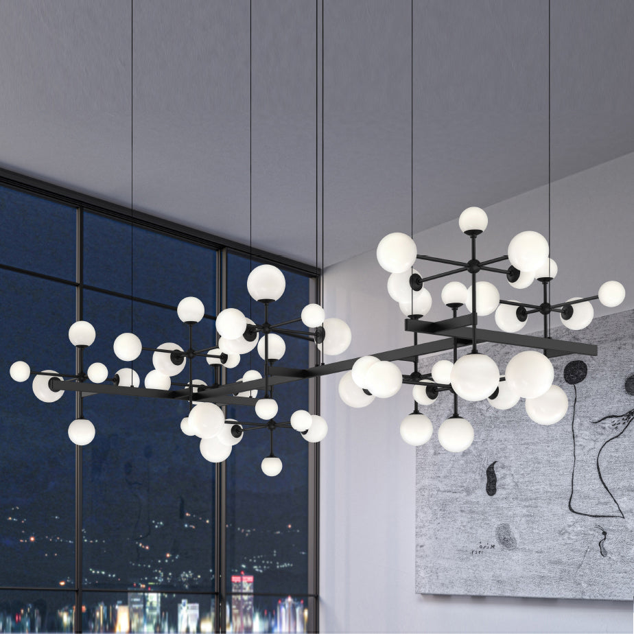 The Nebula Zig Zag LED Chandelier is a striking addition to any interior space. The intricate, starburst design is brought to life by numerous LED bulbs, encapsulated within globe-shaped, cased glass shades for a soft and diffused lighting effect. Its modern style suits a variety of settings, making it a versatile choice for living rooms or dining rooms.
