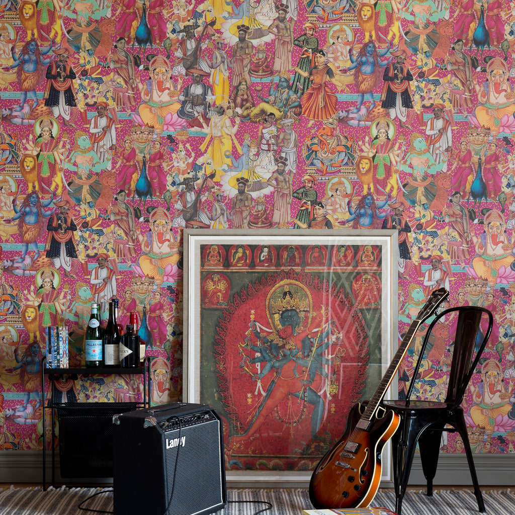 A surprising collage in a pop art style, inspired from the Hindu Gods and Goddesses. This unique wallpaper is visually appealing in every environment.