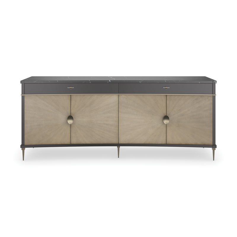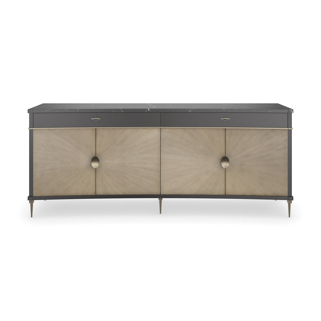 A contemporary take on French Directoire style, the Noir 4-Door Buffet from Caracole brings a Neoclassical architectural presence to the modern home. This stunning buffet is defined by its radiating door fronts, which are crafted from elegant Tiger Maple veneers in a Gray Gables finish to highlight the intricate wood grain. For a touch of drama, the case is finished in a deep Almost Black and punctuated by shimmering Brushed Gold accents. A luxurious black marble top adds a final layer of depth and a durable surface for serving and display, completing this unforgettable centerpiece.