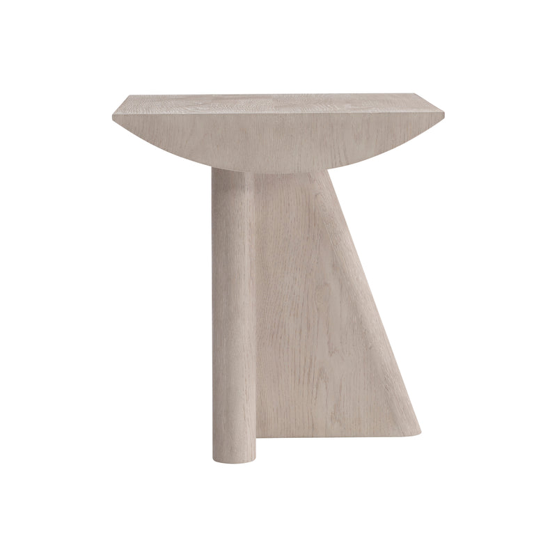 A study in quiet sophistication, the Norden Side Table from Bernhardt is a stunning statement in modern, architectural design. Inspired by Japanese architecture, this unique table features a beautiful half-circle top crafted from wirebrushed oak. The textural top is supported by a bold, angled base formed from two intersecting triangles, creating a captivating play of pure geometry. A fusion of global inspiration and minimalist form, it brings a calm, contemplative style to any living space.