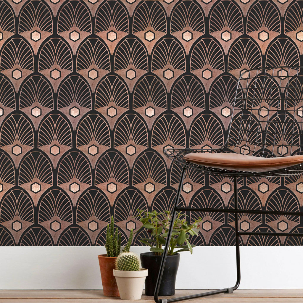 A splendid piece from our Metropolis collection, with repetitive pattern in copper shades on a black background.