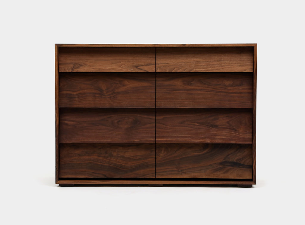 ARTLESS Oliver Tall Dresser is 40 inch tall comprising eight drawers. It has the same footprint as the small dresser but with the added height. The challenge of maximizing storage capacity in a dresser is to prevent it from looking like a huge box. The beautiful grain of the walnut is the main design element and thus the success of the piece.