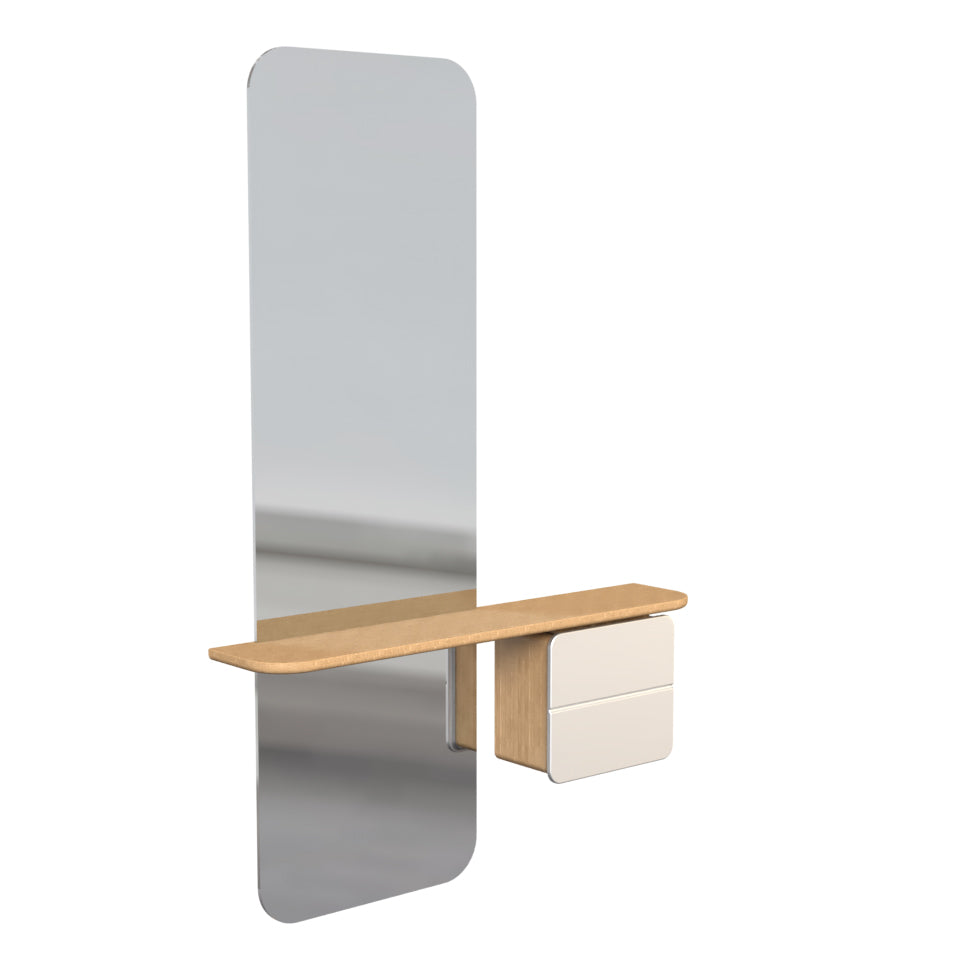 One More Look is a wall mirror with a minimalistic Scandinavian feel and added functions to meet the everyday needs of urban living. Taking up minimal space, One More Look is ideal for hallways of all sizes, as well as bedrooms, hotels and office corridors. The elegant full-length mirror is just the right height for checking your whole appearance before you leave. The attached solid oak shelf includes a bijou cabinet with a painted door. Inside the cabinet is a removable hand-held mirror, while smaller items like keys, makeup, sunglasses, and spare coins can be placed in the leather tray in the cabinet.