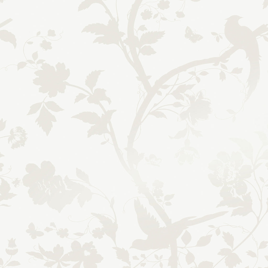 Enhanced with pearlescent inks, Oriental Garden Pearlescent is glamorous and elegant. This botanical wallpaper features beautiful, silhouetted birds and butterflies in an exotic garden. Shimmery natural details on an off-white background allow this print to stay classic and calming. Pink details on a shimmery natural background allow this print to add a pop of color while still saying classic