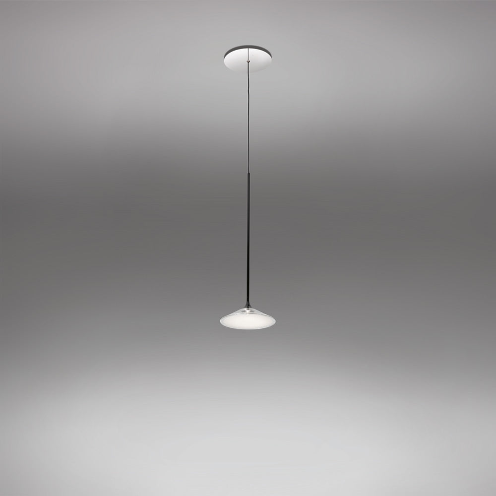 The design of the glass cover ensures that the light source remains invisible, making the pendant appear like a floating disk of light.