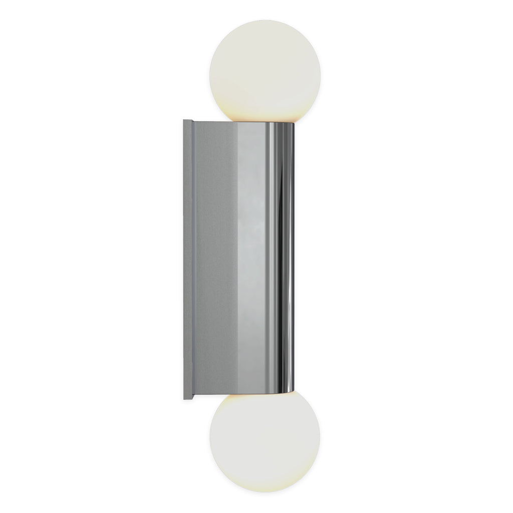 This simple, geometric bathroom wall sconce is designed for use alongside mirrors. Available in single or twin configurations, its replaceable opal-glass shades diffuse a warm, ambient glow. The bracket, available in Matte Black or polished chrome, is die-cast for enduring quality and a crisp finish.