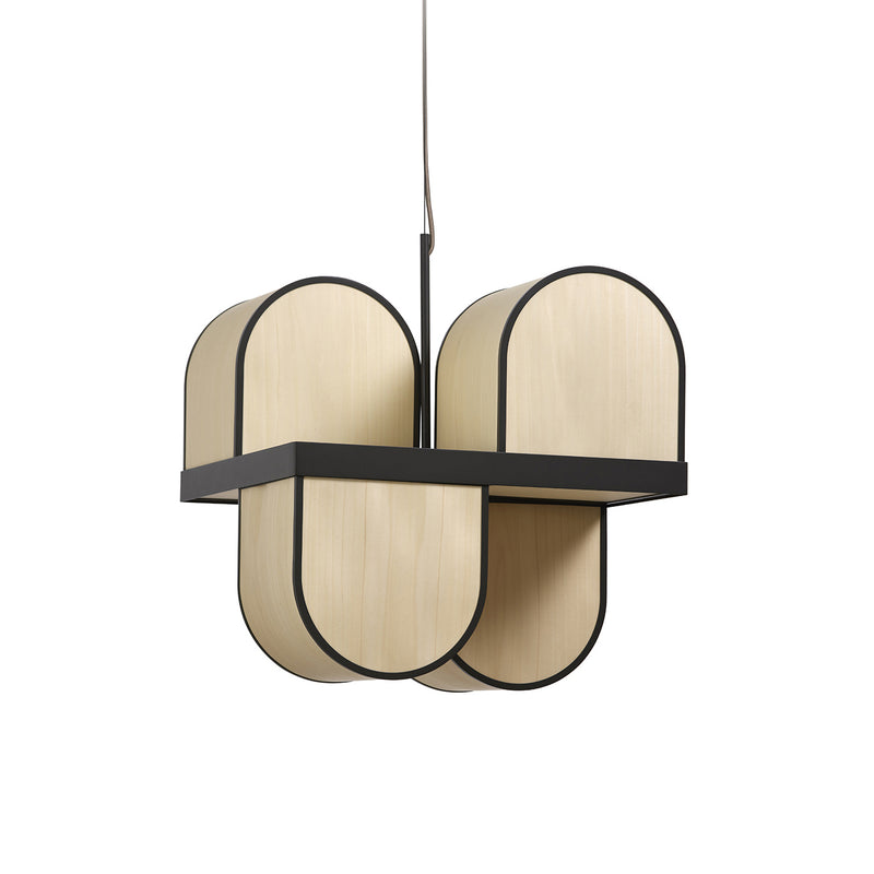 - Interlocking three-dimensional wood veneer arches face both upwards and downwards, giving the lamp a uniquely sculptural form