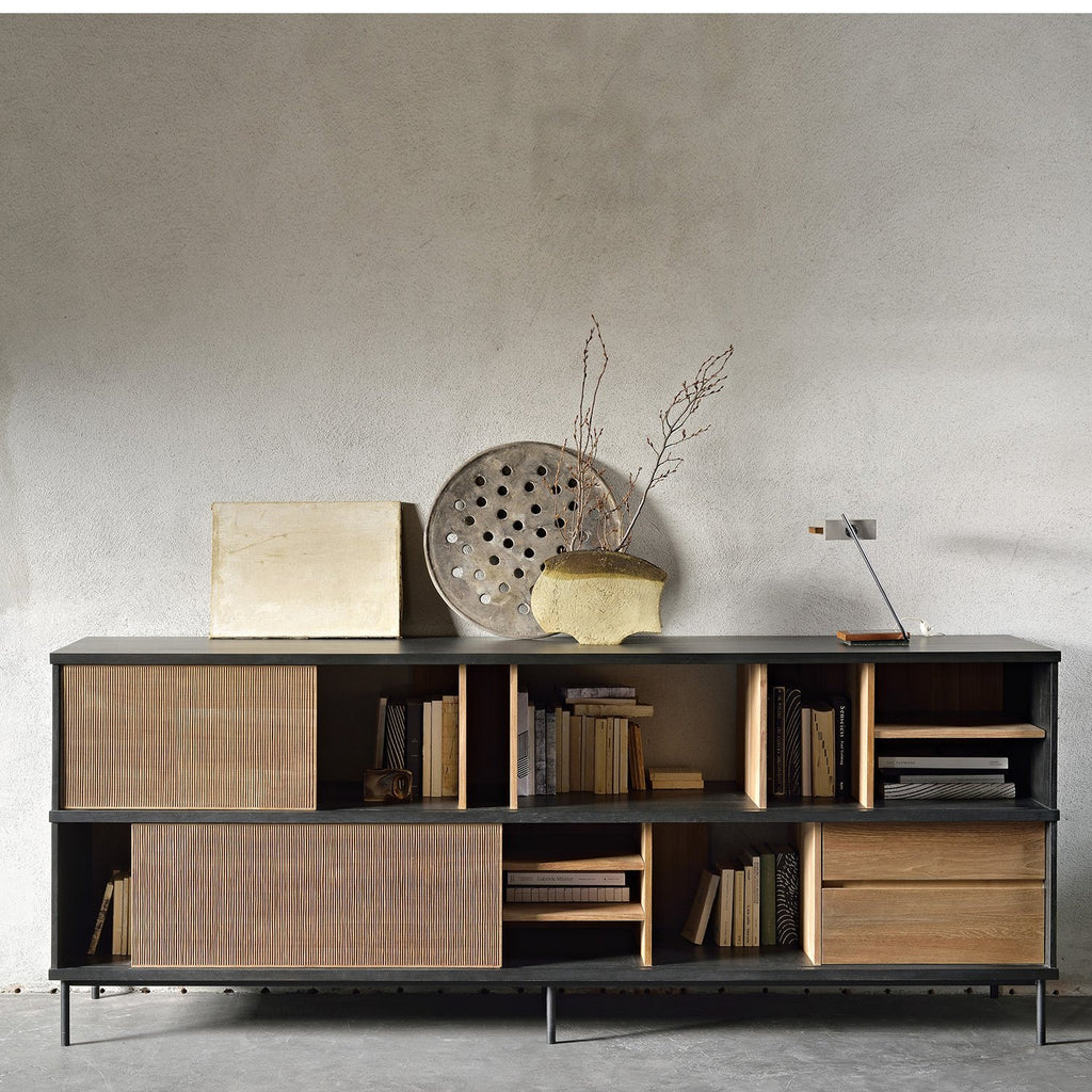 Perfectly suited for an open hallway space or for storage in your living or dining room, the Oscar Sideboard from Ethnicraft brings striking sophistication to any room in your home. Incredibly practical without sacrificing on beauty, this sideboard features a solid teak wood body sitting atop a contrasting black metal legs. Outfitted with multiple open storage sections, this sideboard also offers hand-carved sliding doors to keep certain items secure and out of sight. Station in the dining room to hold all your needs for the perfect dinner party, or station in the entryway to hold all out-the-door essentials to make your morning routine a breeze.