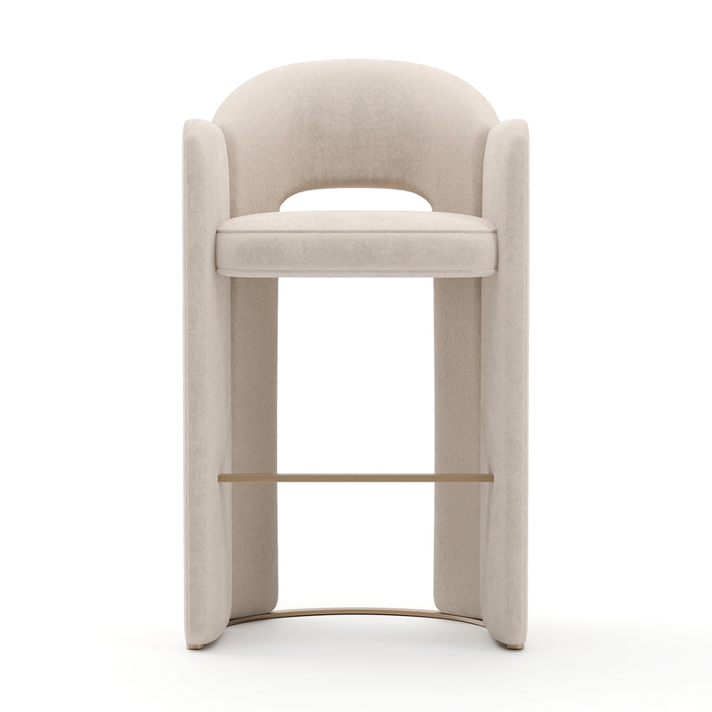 The Overlap Stool brings a sense of high-fashion elegance to the kitchen island or home bar, blending plush upholstery with radiant metallic accents. Wrapped entirely in a luxurious ivory vintage velvet, this stool features a curved, low-profile backrest that provides comfortable lumbar support while maintaining a sleek silhouette. The design is punctuated by sophisticated "spline" details in a Whisper of Gold finish, which wrap around the upholstered body to add a touch of jewelry-like brilliance. Grounded by a slender metal framework, it includes a matching gold footrail that offers a comfortable place to rest your feet while protecting the velvet from wear. Available in both counter and bar heights, this stool serves as a polished, modern anchor that elevates the surrounding cabinetry and countertop materials.