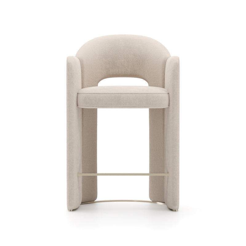 The Overlap Stool brings a sense of high-fashion elegance to the kitchen island or home bar, blending plush upholstery with radiant metallic accents. Wrapped entirely in a luxurious ivory vintage velvet, this stool features a curved, low-profile backrest that provides comfortable lumbar support while maintaining a sleek silhouette. The design is punctuated by sophisticated "spline" details in a Whisper of Gold finish, which wrap around the upholstered body to add a touch of jewelry-like brilliance. Grounded by a slender metal framework, it includes a matching gold footrail that offers a comfortable place to rest your feet while protecting the velvet from wear. Available in both counter and bar heights, this stool serves as a polished, modern anchor that elevates the surrounding cabinetry and countertop materials.