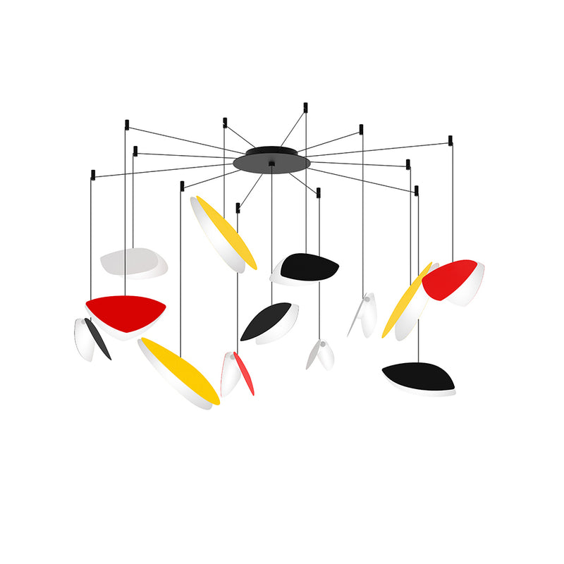 Delicately floating in suspension, these iconically modern, whimsical shapes bring the pathos of Modernism and the colors of Mondrian and Miró to the technology of today's art of light. Available in several configurations, these light sculptures offer scale to modern primitive environments that playfully allow the activity of movement within its space.