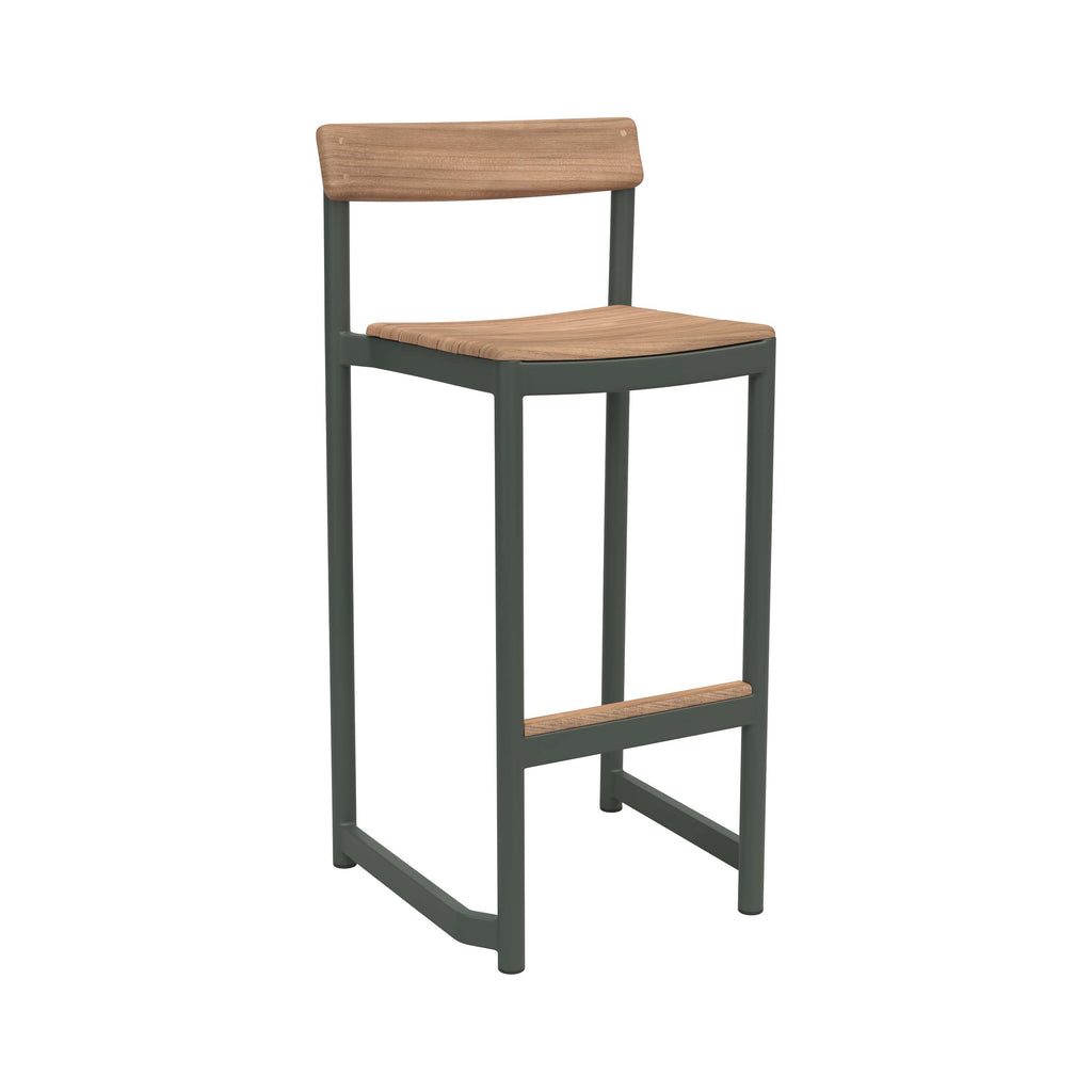 Elevate your outdoor dining experience with the Pelagus Stool from Fritz Hansen. Crafted from solid teak and powder-coated aluminum or stainless steel, it offers a slender, contemporary design that doesn't sacrifice comfort or functionality. Perfect for small spaces, the Pelagus series also includes cafe tables, high table options, and stackable stools.