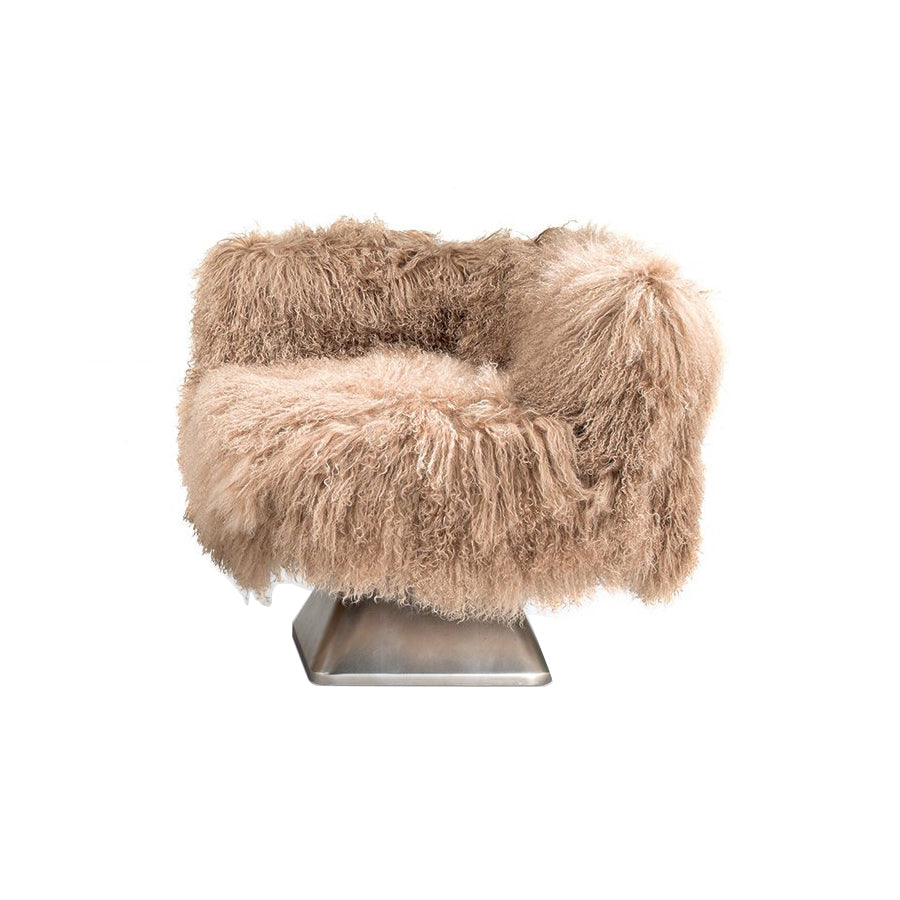 The Pemba Swivel Lounge Armchair from Fratelli Boffi offers a unique blend of comfort and striking design. Its cocoon-like seat, upholstered in soft camel-colored Mongolia leather with natural long-haired fur, envelops the body in luxurious softness. The angular, geometric seat contrasts with a pyramidal wooden base finished in bronze-colored silver leaf, creating a sophisticated balance of materials. Padded with differentiated-density polyurethane foam, the armchair delivers both support and style, making it a distinctive centerpiece for any modern interior.