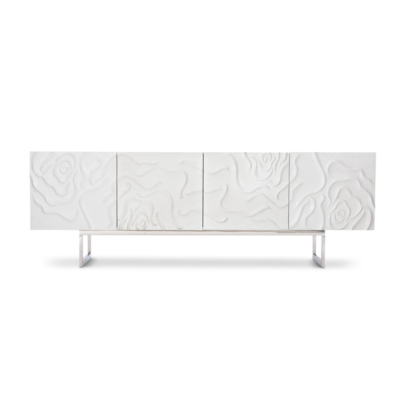 The Penrose credenza features an elegant floral motif with graceful swirls across its front. Its bright white plaster finish offers a refreshing contrast to the sleek, polished stainless steel base, which boasts modern, clean lines. Inside, four soft-closing doors open to adjustable, removable shelves, complemented by grommet holes for convenient wire management.