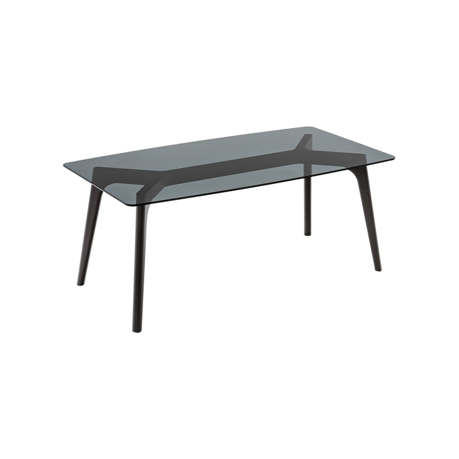 Elevate your dining experience with the Pod Fixed Dining Table, an exquisite fusion of wood and glass. The solid wood frame exudes strength, while the transparent or smoked glass top showcases the skilled craftsmanship of beveled and polished wood. Sleek tapered legs add a touch of dynamism to the elegant design, making every meal a stylish affair.