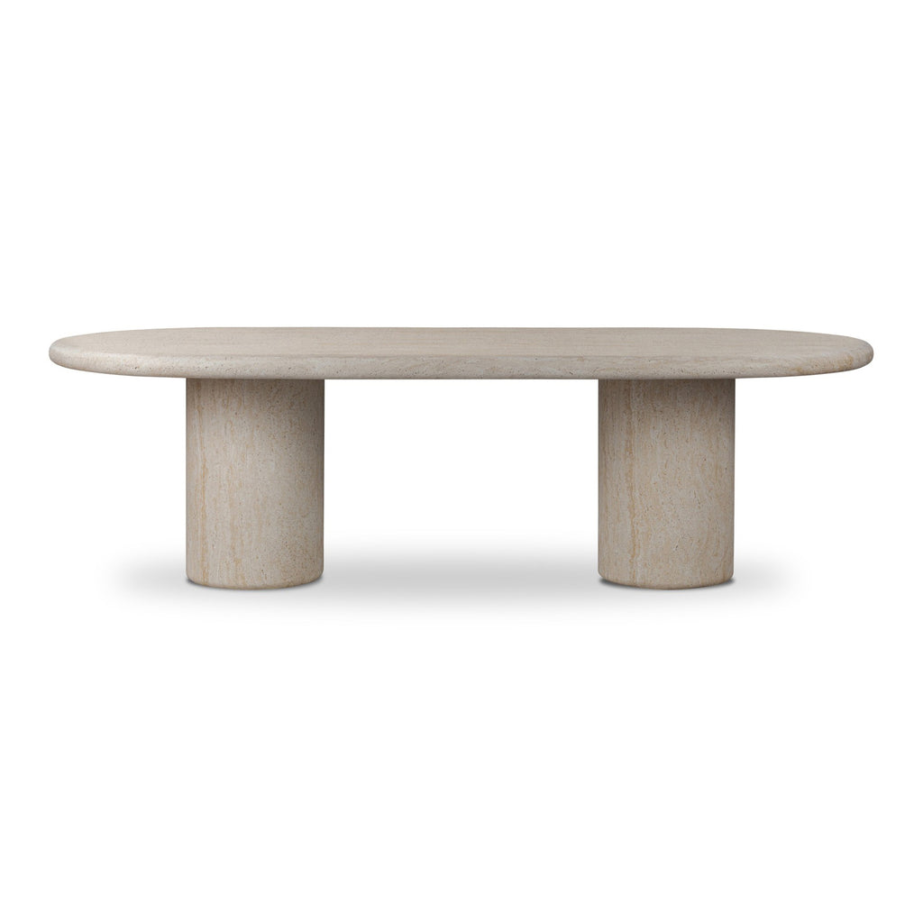 Indulge in luxurious al fresco dining with the Poole Outdoor Dining Table from Four Hands. Its sleek double pedestal design allows the stunning textured sand concrete to take center stage, reminiscent of natural stone with a unique marbled appearance. With the option to cover or store indoors, enjoy this elegant piece rain or shine.