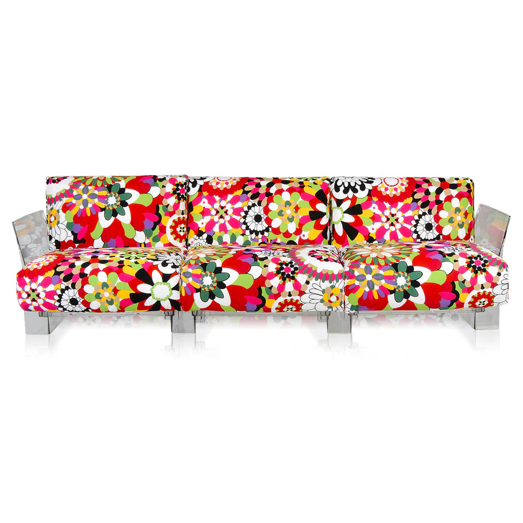 Bring timeless sophistication to your living space with the Pop Missoni Sofa by Kartell. An exquisite piece of furniture, this sofa features a bold floral pattern with soft upholstery and goose-down cushions for the ultimate comfort. Its statement-making angled plastic armrests provide extra support, and the durable materials ensure it will be a timeless staple in your home.