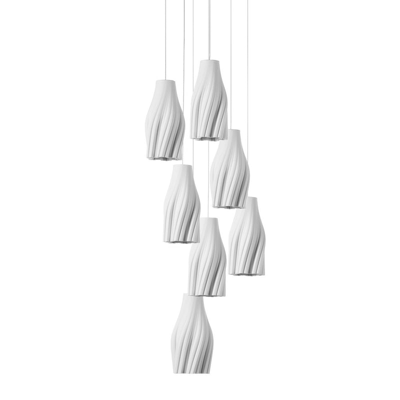 Indulge in the artful elegance of the Posh Round Multi Light Pendant Light from Currey & Company. Each shade is expertly crafted with white ceramic, resembling delicate tassels. The artisanal movement of the material adds a graceful touch. Suspended by thin silver cables, the shades steal the show in this exquisite design.