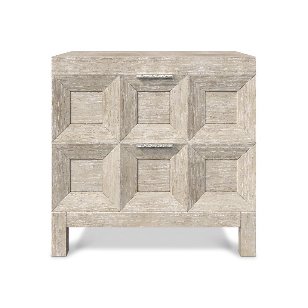 Elevate your bedroom oasis with the Prado Nightstand from Bernhardt. Inspired by the ceilings at the Prado Museum, this nightstand boasts two pull-to-open drawers with geometric cast resin overlays and a sleek Tawny finish. With a two-port USB unit on the back, convenience meets elegance in this luxurious piece.