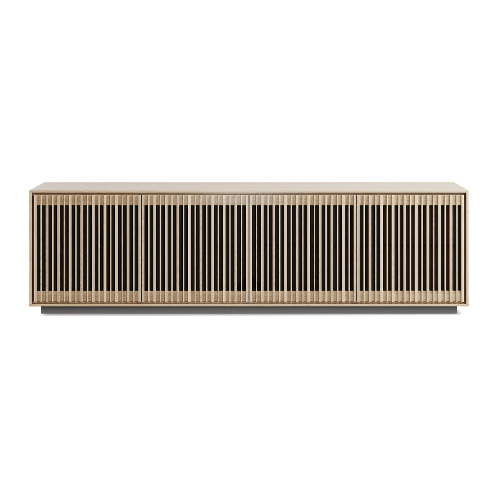 - Hardwood slatted doors beautifully conceal contents while providing ventilation, acoustic transparency, and remote control accessibility
